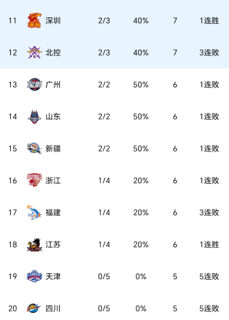 从以上积分榜来看,北京队、广东队继续保持全胜,辽宁队、广厦队都是4胜1负,分列第三、第四,另外全败的球队仅剩天津队、四川队,江苏队已经拿到了首场胜利。作为昔日的总冠军,四川队本轮比赛遭遇51分的惨败,继续沦为垫底位置。