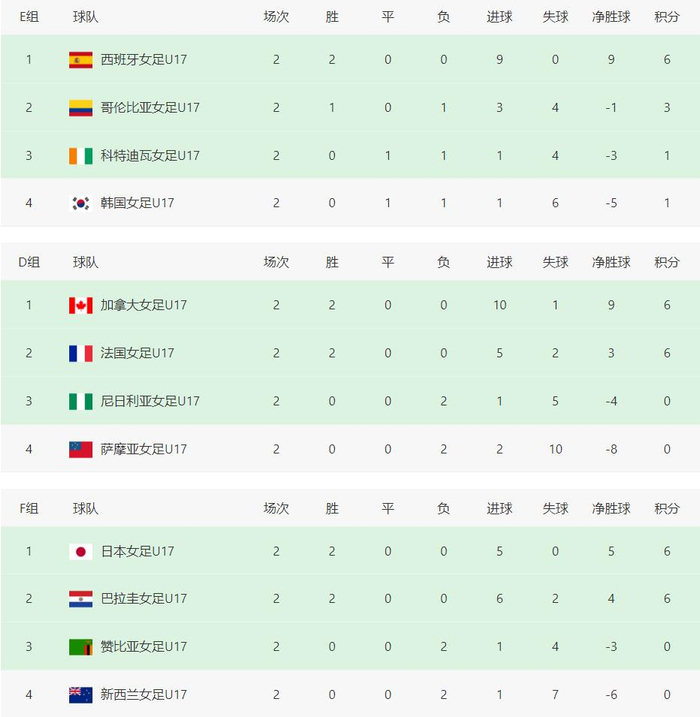D组的加拿大、法国同积6分,已经提前一轮出线,尼日利亚、萨摩亚同积0分,分列第三和垫底,出线形势不容乐观。