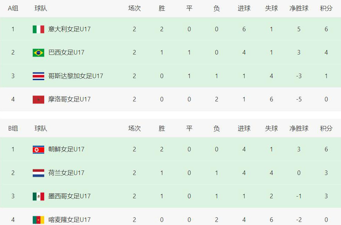 其他五个小组方面,A组的意大利、巴西,已经提前一轮出线,哥斯达黎加积1分排名第三,东道主摩洛哥积0分沦为垫底。